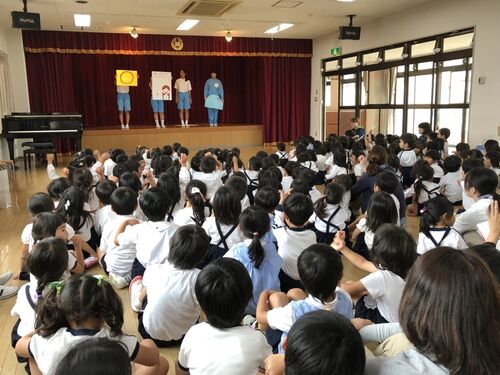 今日は5月のお誕生日会。 名前、年齢を大きな声で発表後は、園長先生からキラキラのメダルを頂きました^^ 今月の先生たちからのプレゼントは『避難訓練のお約束』劇。 幼稚園で火事があったときはどうやって避難するのかな? 「お・は・し・も・ち」の約…