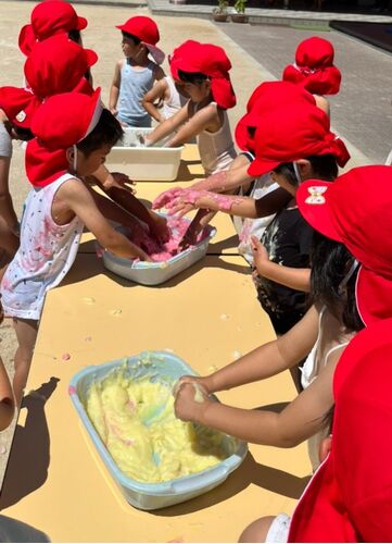年長組、年中組はボディペインティングを、年少組はフィンガーペインティングをしました! ボディペインティングは、小麦粉を水で溶かして作った絵の具を使い遊びました! どろっとした感触を味わいつつ、自分の体にひたすら塗り込んだり、先生の背中に付け…