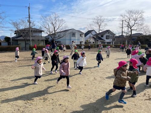 今日は年長組と年中組の耐寒遠足! ウッディタウンにある、はじかみ池公園まで行ってきました! 寒さに負けず、最後まで歩くことを目標にし、片道1時間かかる道のりを、往復歩ききることができました! 公園では、みんなで鬼ごっこやだるまさんがころんだを…
